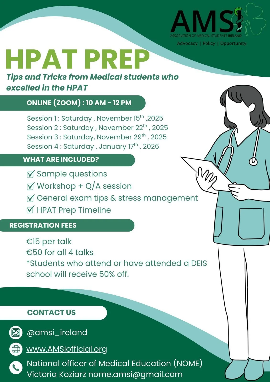 The Association for Medical Students Ireland, the unified network representing medical students from all eight medical schools in the country, extend an invitation to attend our HPAT preparatory workshop to any and all students with the intention to sit the 2026, 2027, or 2028 HPAT examination.