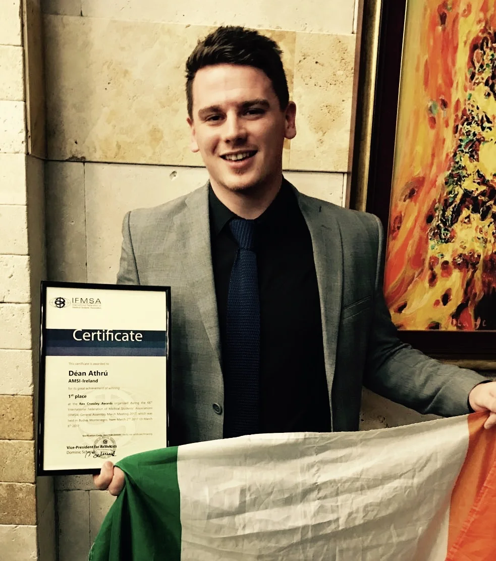 Déan Athrú was selected as one of the 10 best medical student run projects worldwide in 2016 by the IFMSA and subsequently was awarded 1st Place in the Rex Crossley Awards in Budva, Montenegro.
